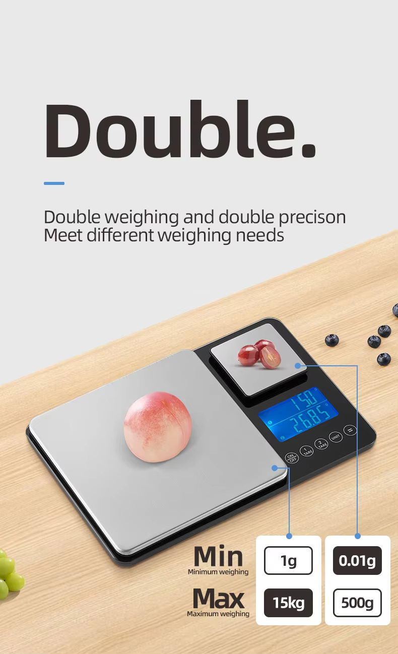 Capacity/Division | Big platform: 15kg/1g Small platform: 500g/0.01g |
