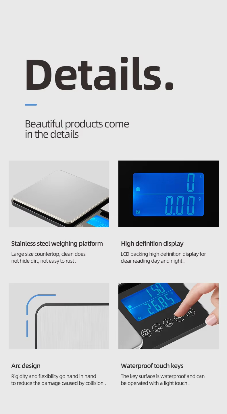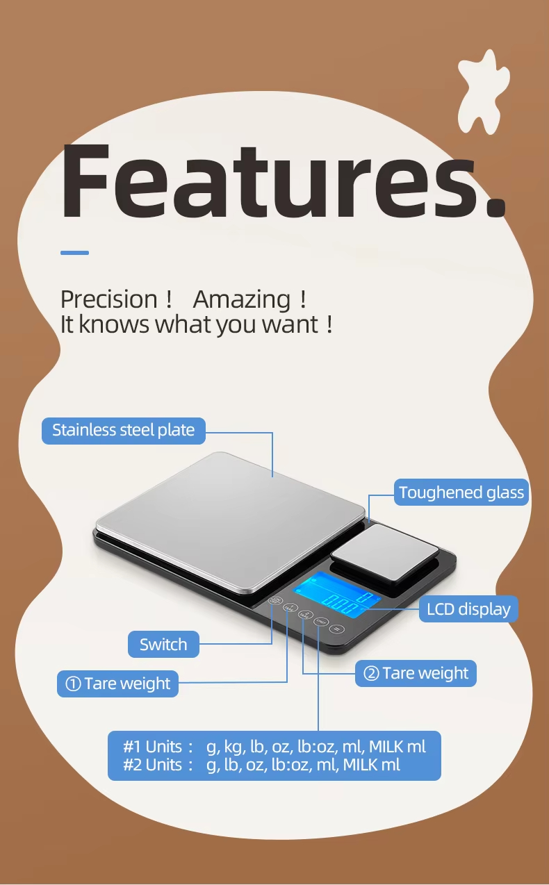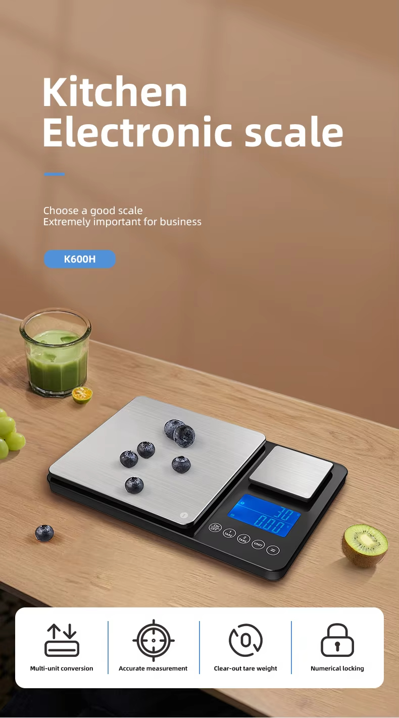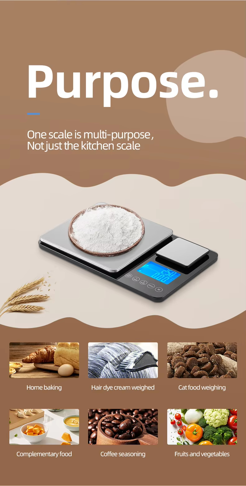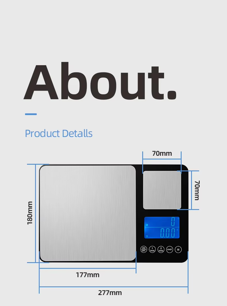 Functions | Auto power off Auto zero Tare function Units conversion Low battery indication Overload indication Sum function(You can get total weights of the ingredients on the two platforms) |