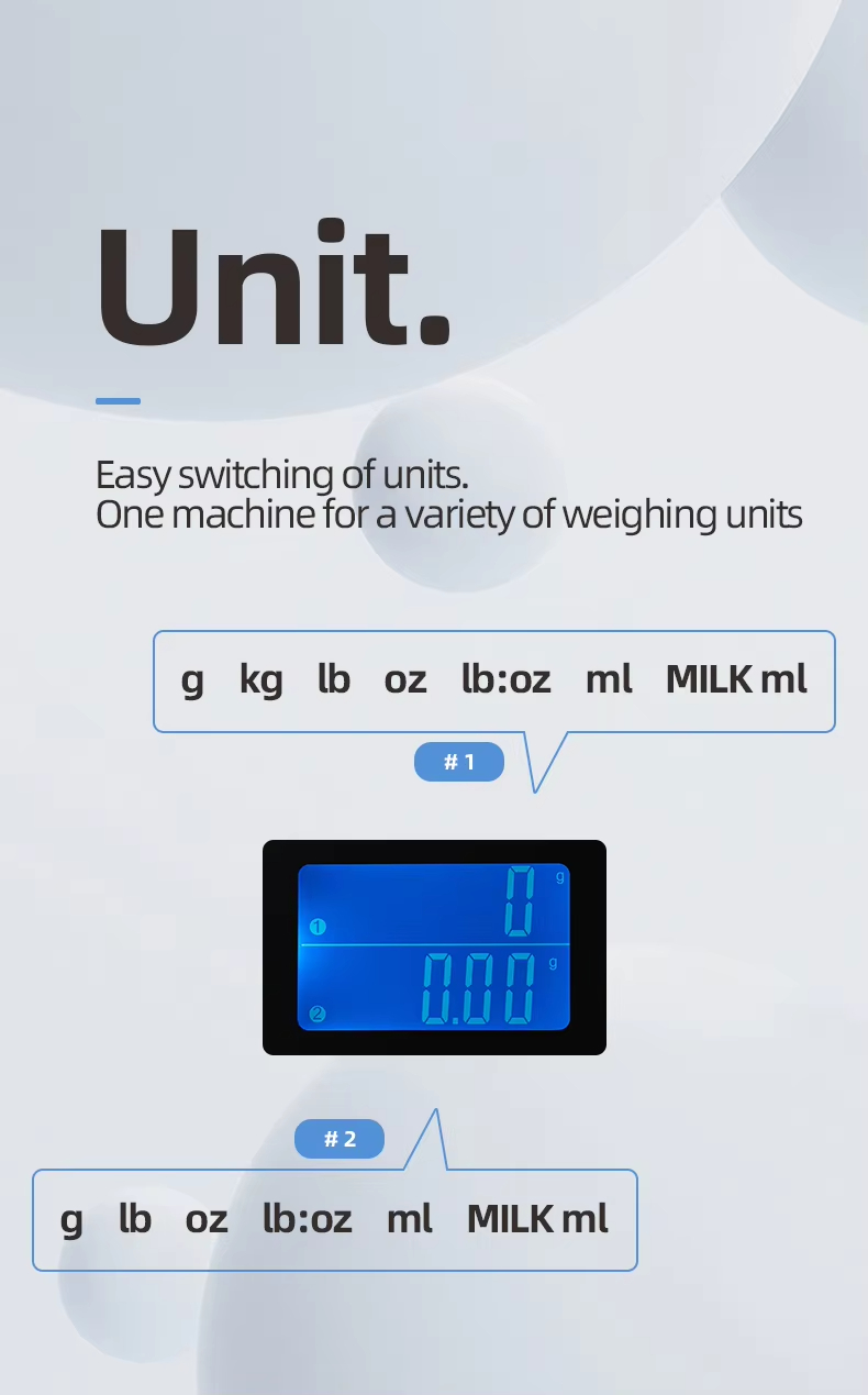 Units | Big platform: g, kg, lb, oz, lb:oz, ml, milk ml Small platform: g, lb, oz, lb:oz, ml, milk ml |